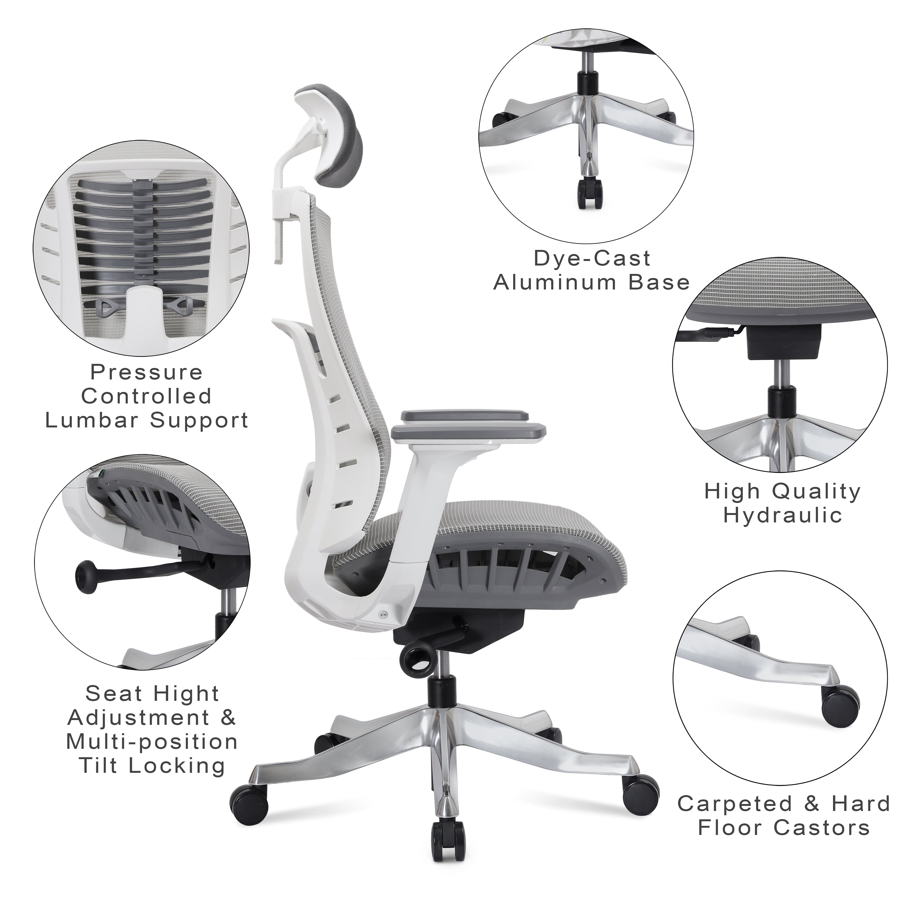 If you work 8–12 hours daily, Go for a high-back chair with a headrest and advanced lumbar support (e.g., Webby, Seoul Grey).
