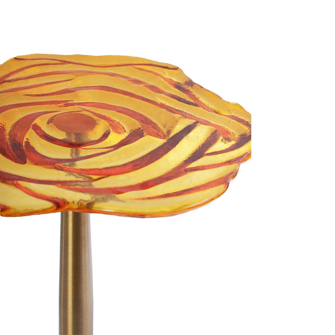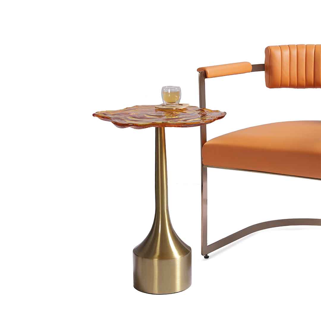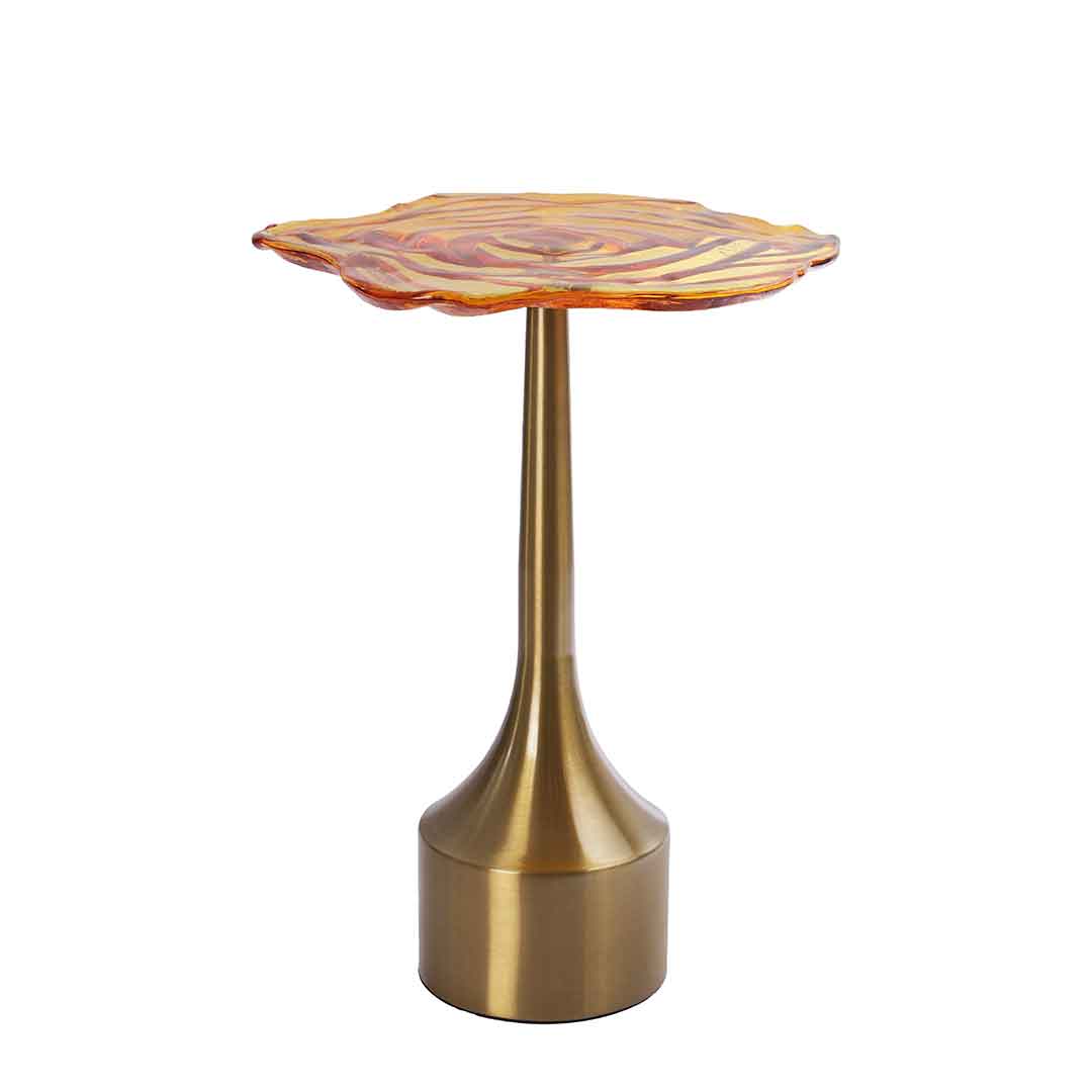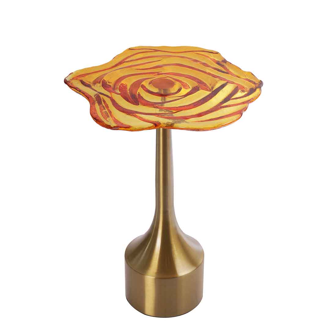 A round table with a red and orange floral-shaped design, embellished with gold details and a central gold leg for an exquisite appearance.