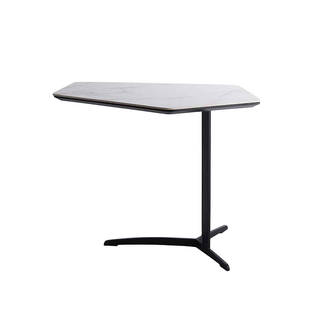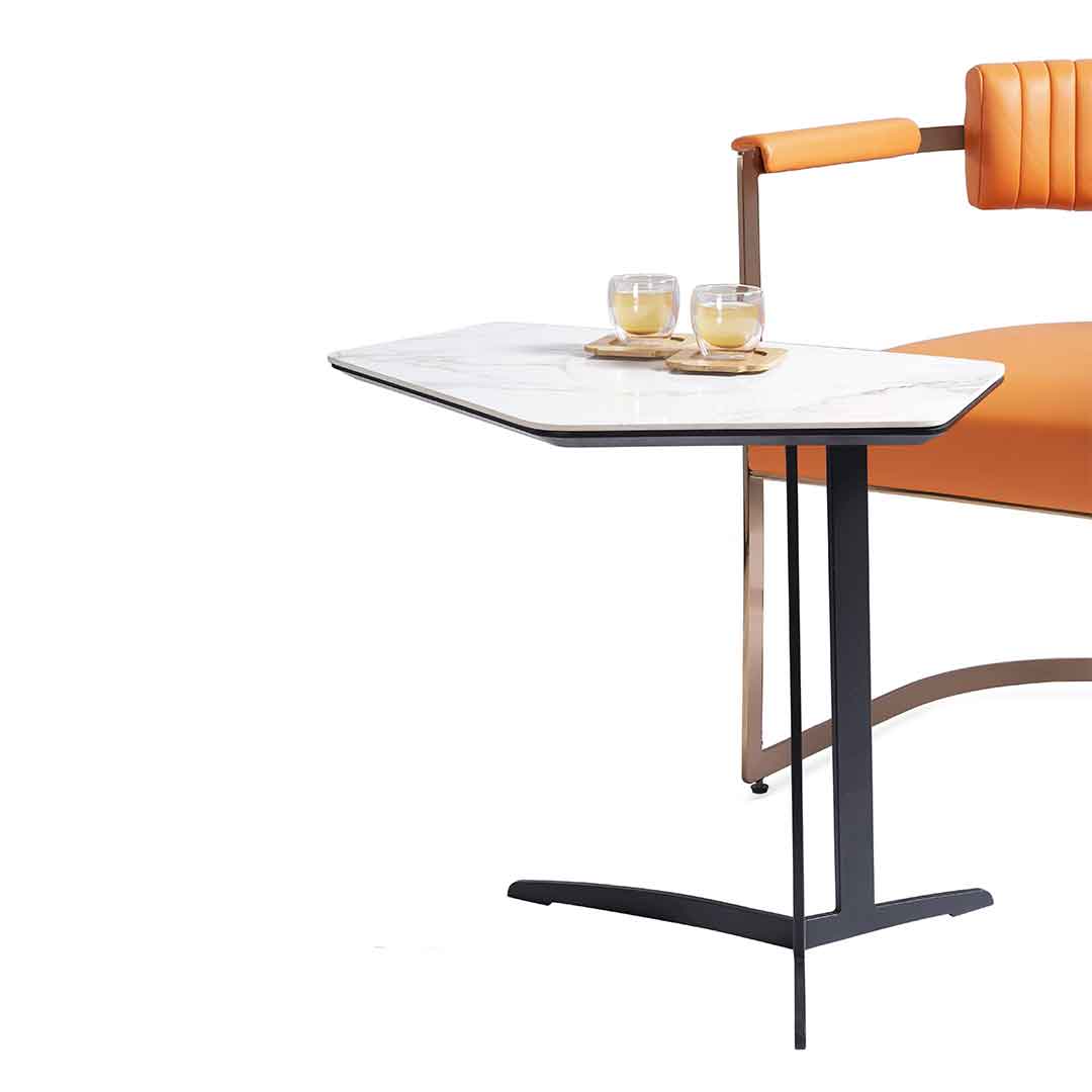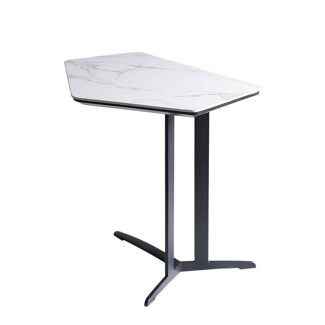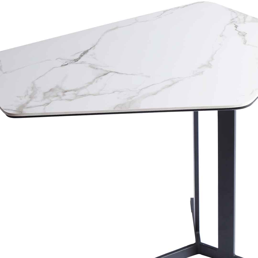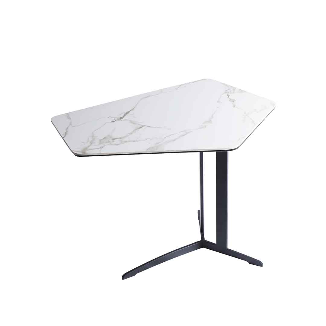 A pentagonal white marble table showcasing intricate grey veining, embodying a harmonious blend of geometric shapes and natural beauty.