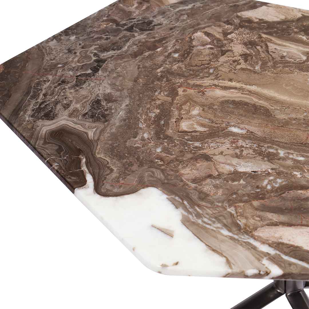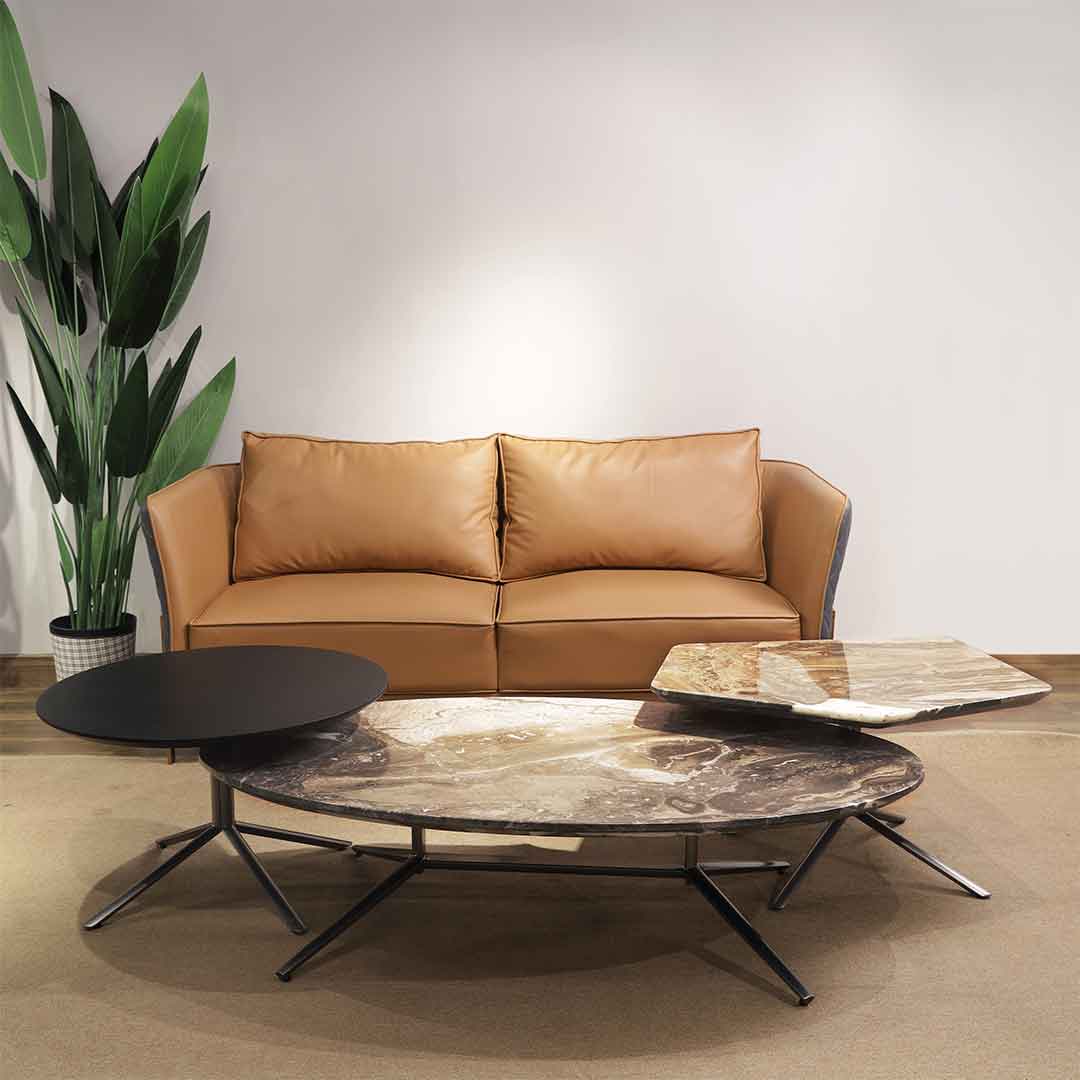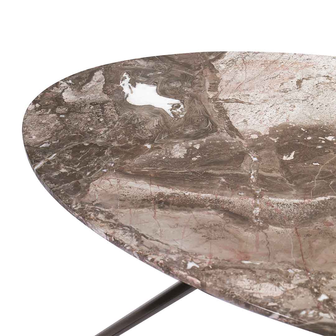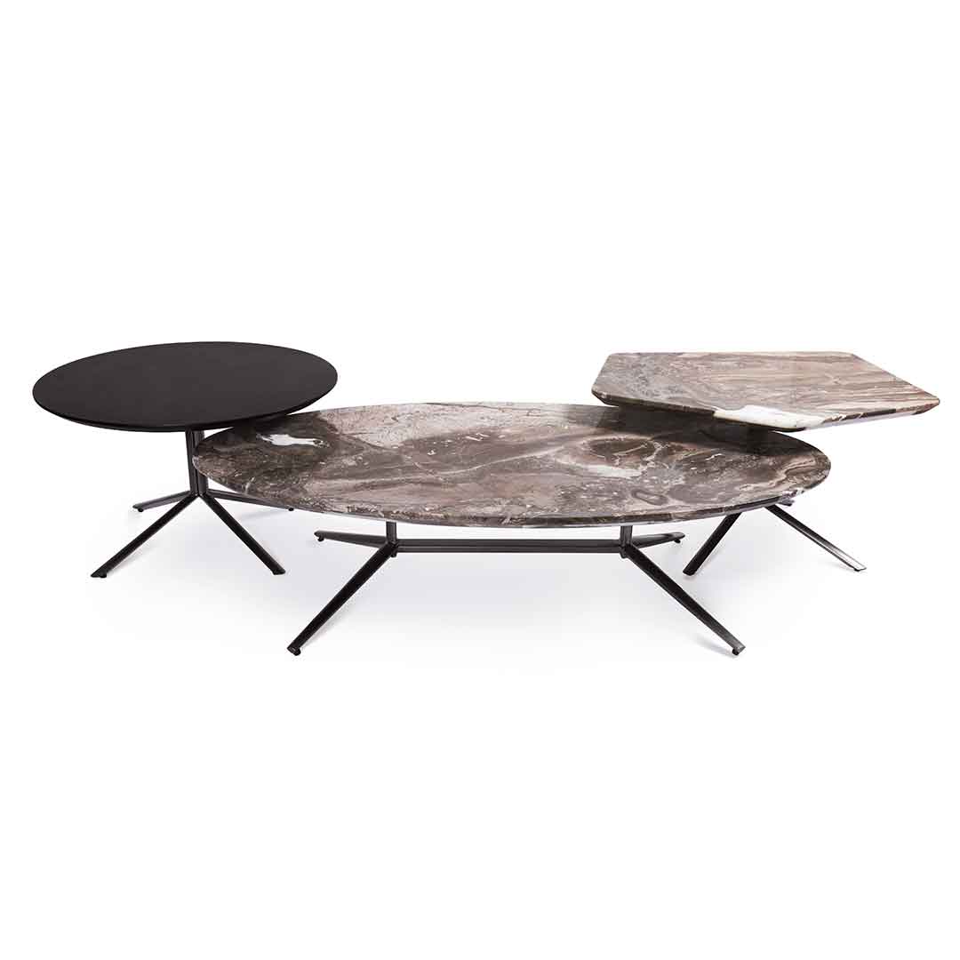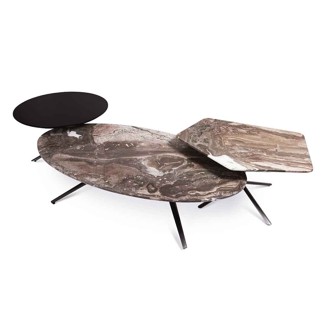 A set of tables with a large oval-shaped grey marble-like table and a small pentagonal table, both sharing the same captivating marble appearance.