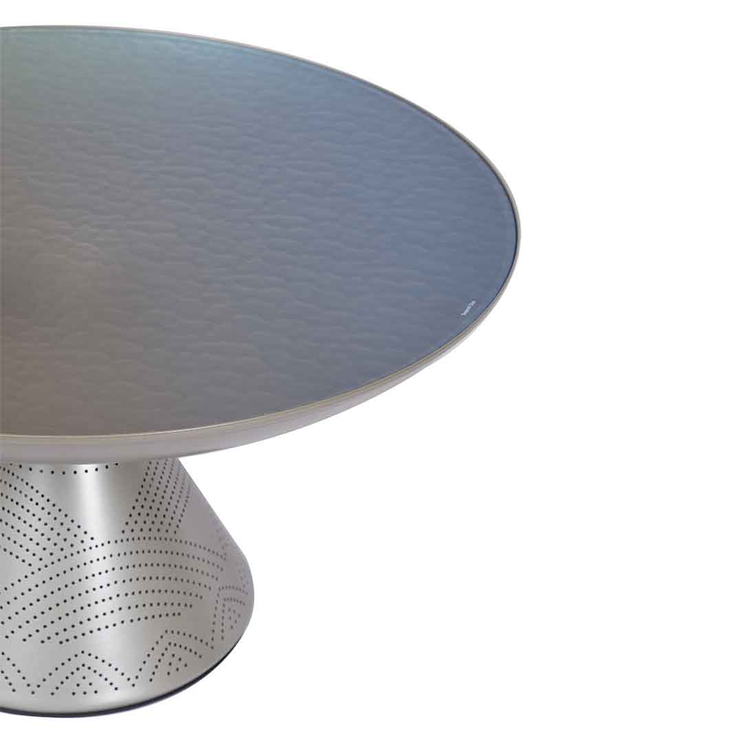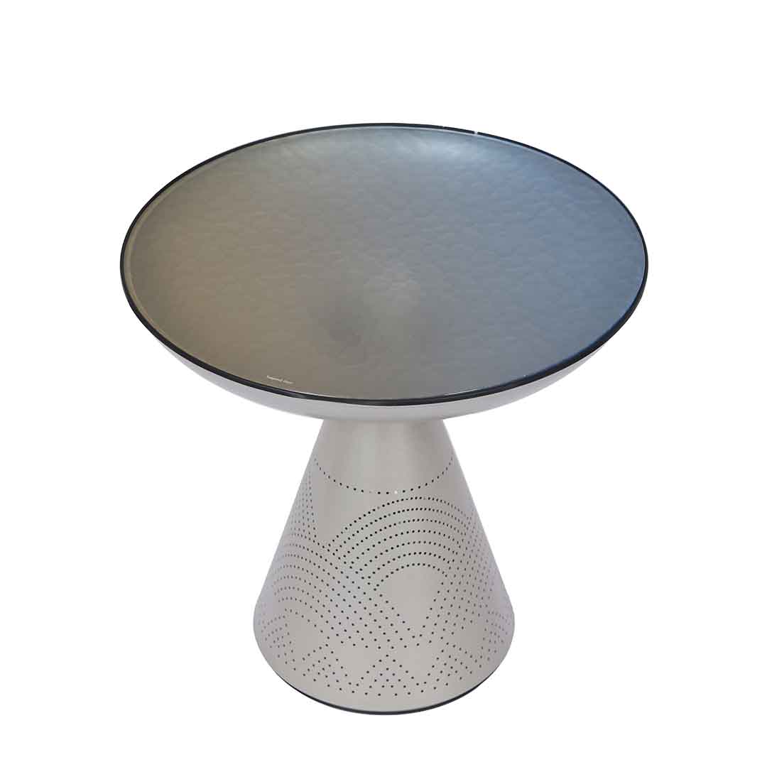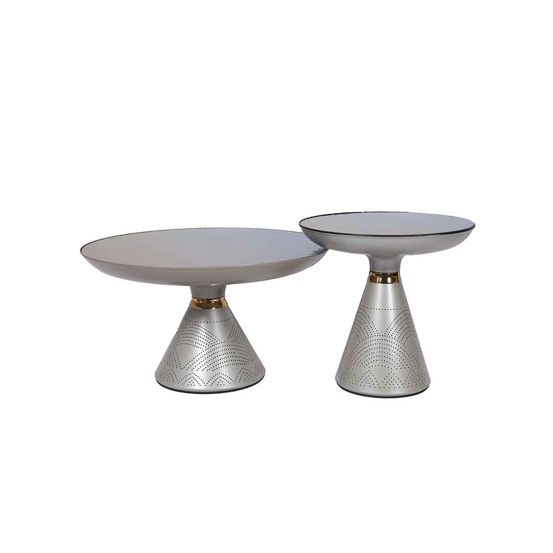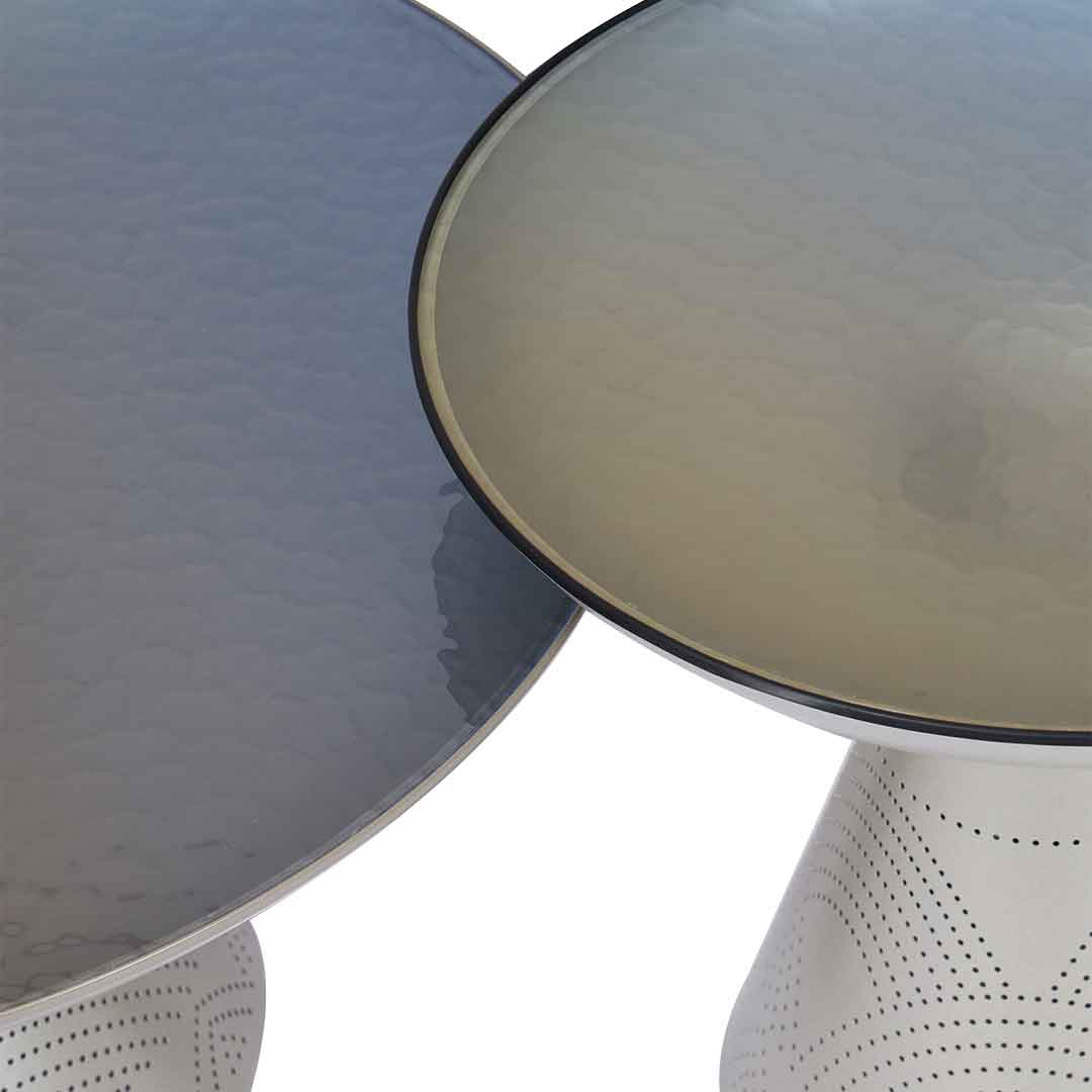 A set of tables featuring a large round glass top table with beautifully carved intricate patterns, accompanied by a small table sharing the same artistic look.