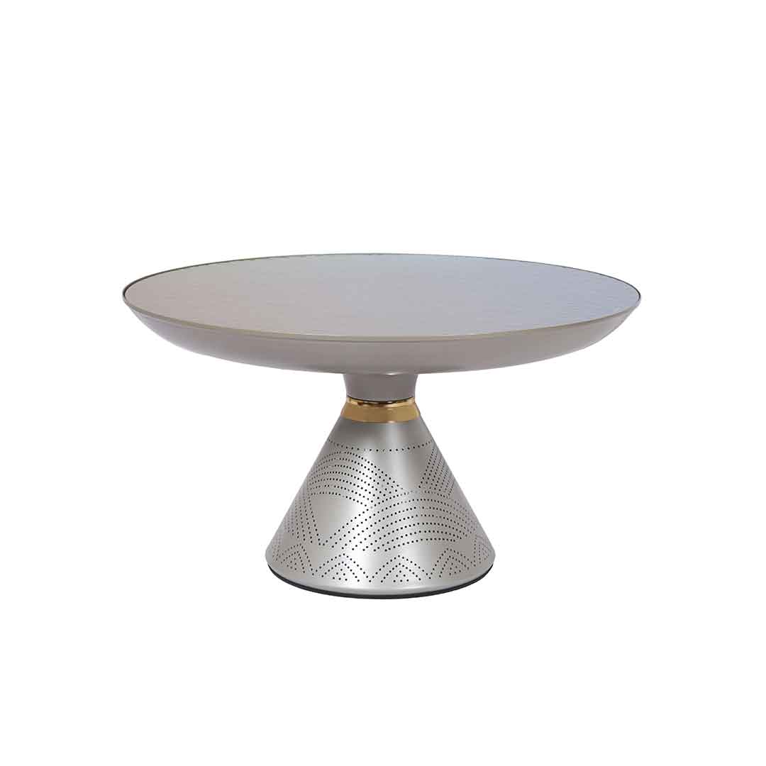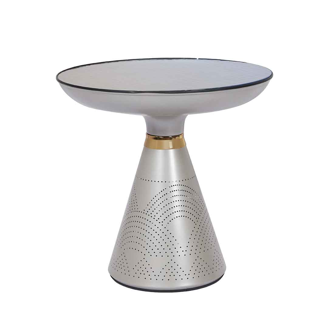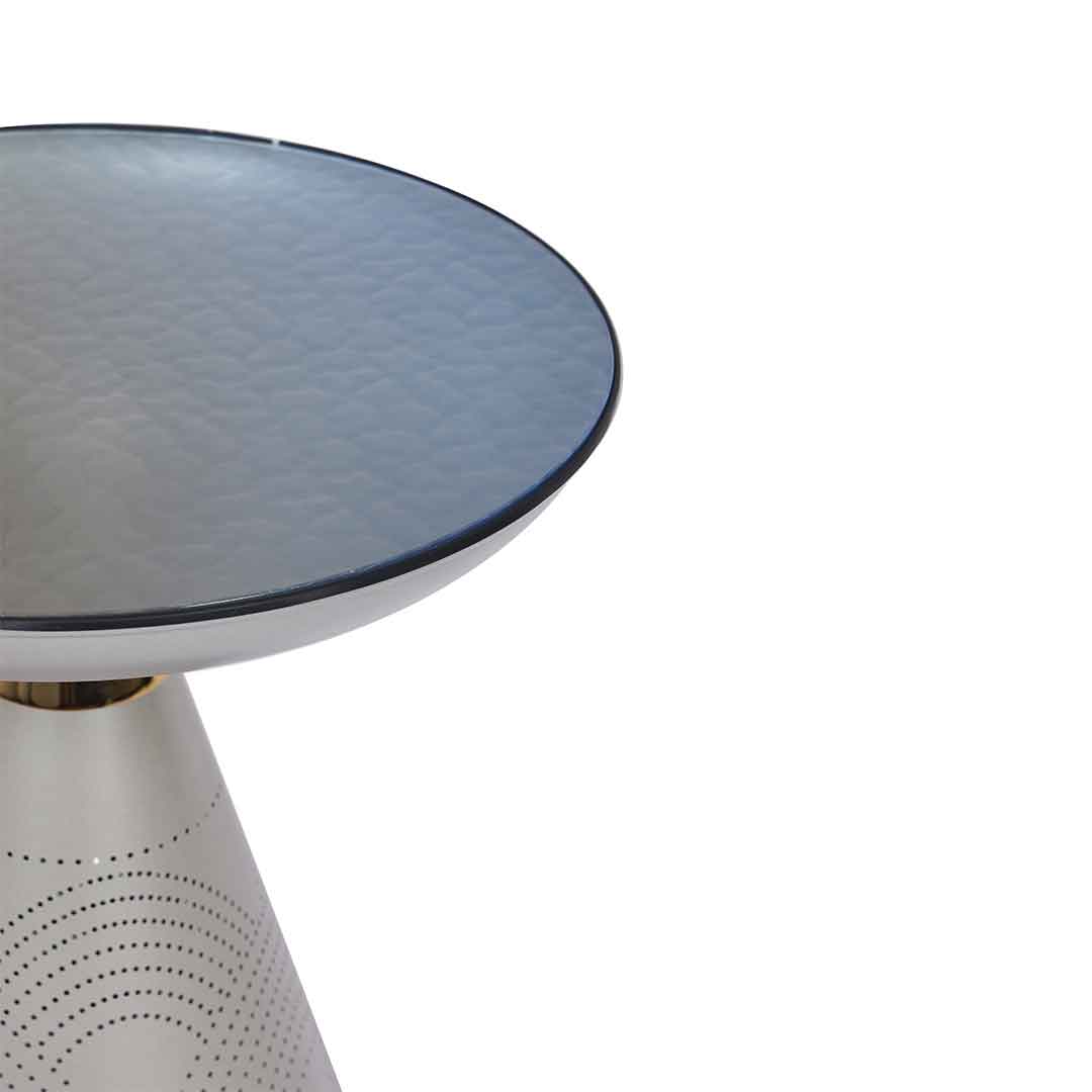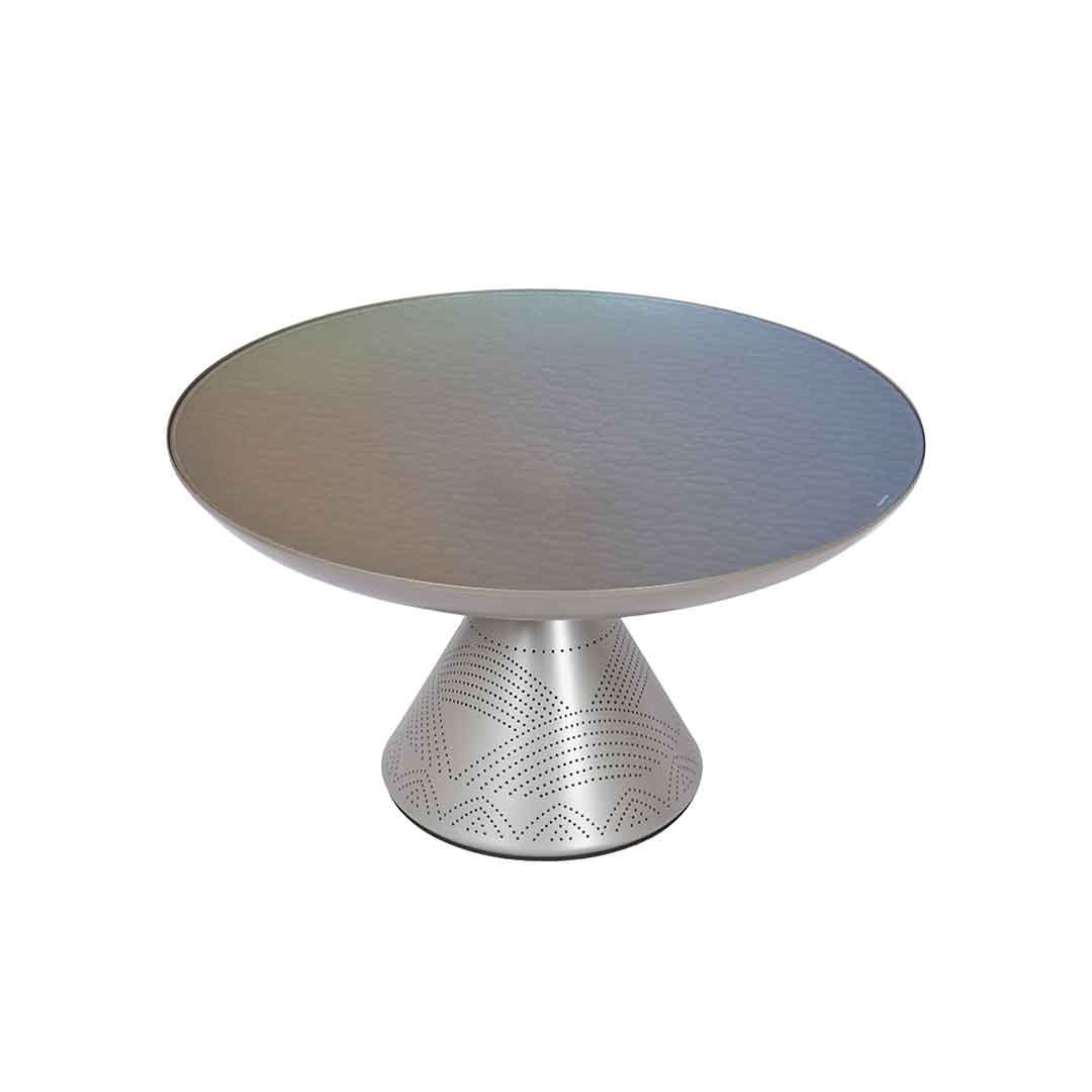 A set of tables featuring a large round glass top table with beautifully carved intricate patterns, accompanied by a small table sharing the same artistic look.