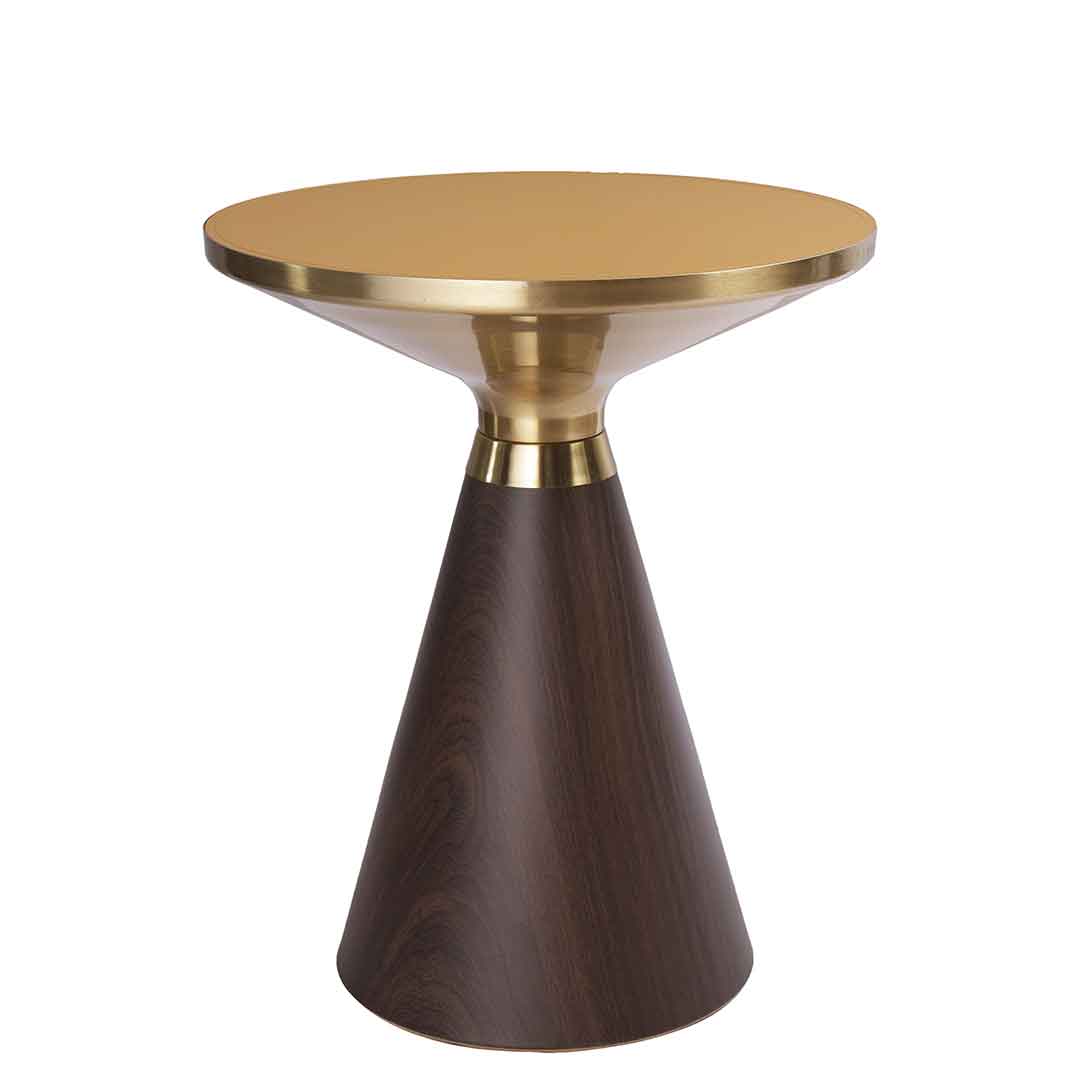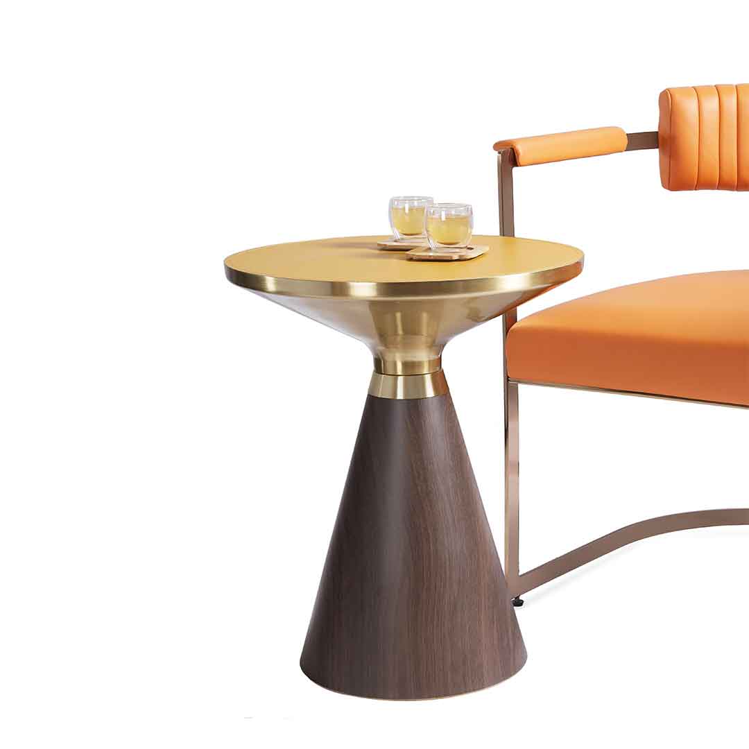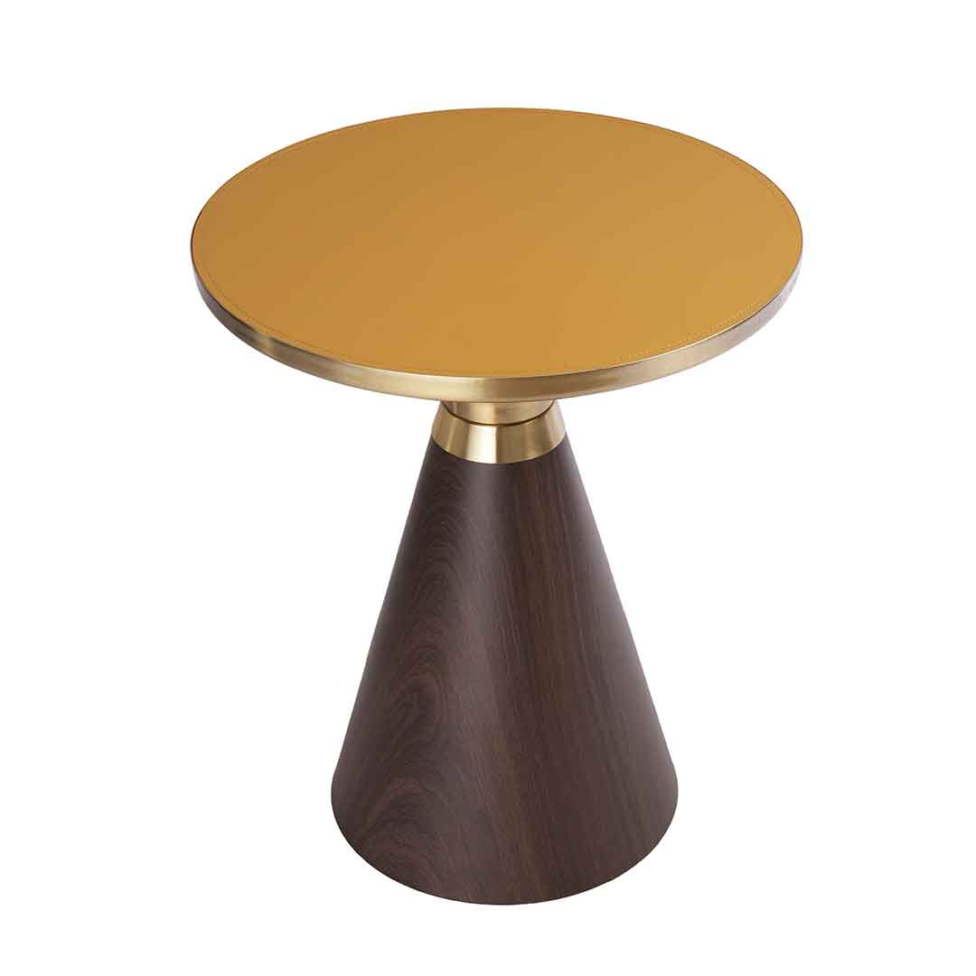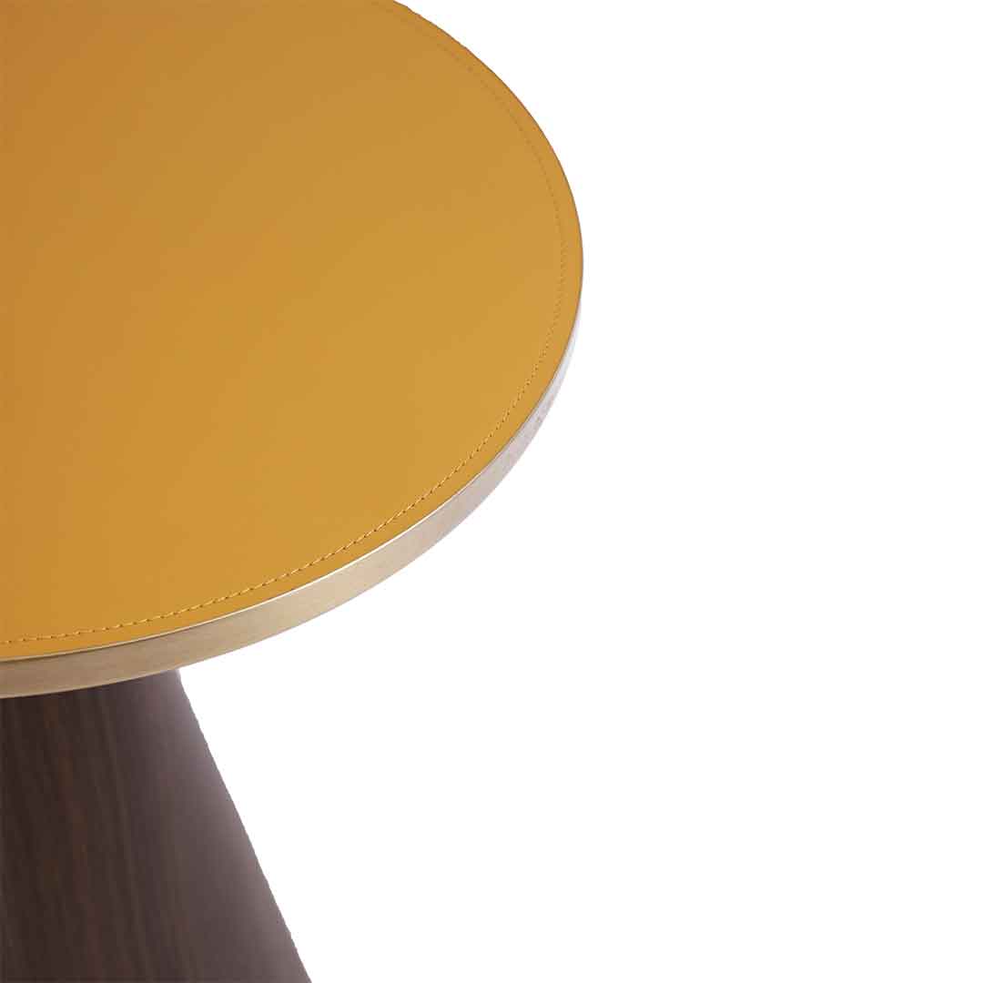 The round mustard-yellow table top is paired with a wooden bottom creating a charming aesthetic.