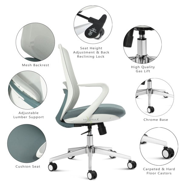 Adorned with a Mesh Back and Adjustable Lumbar Support with cushion, this chair promises sublime comfort and support tailored to your needs. The Cushioned Seat ensures a luxurious seating experience, complemented by Tilt Tension Control and Back Recline Locking for customizable reclining options. With Fixed Arms and a Chrome Base, Prague Blue & White exudes sophistication while offering unrivaled durability and stability.