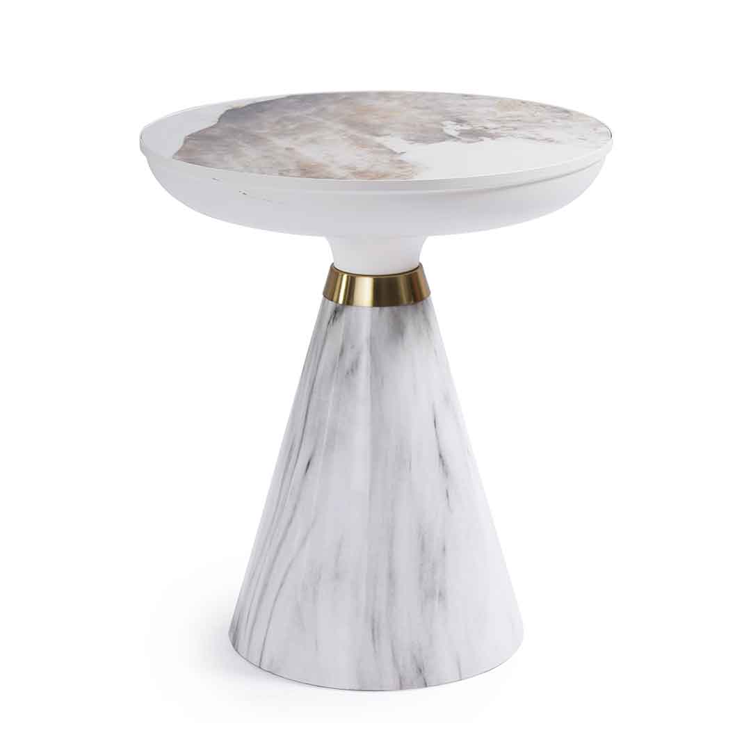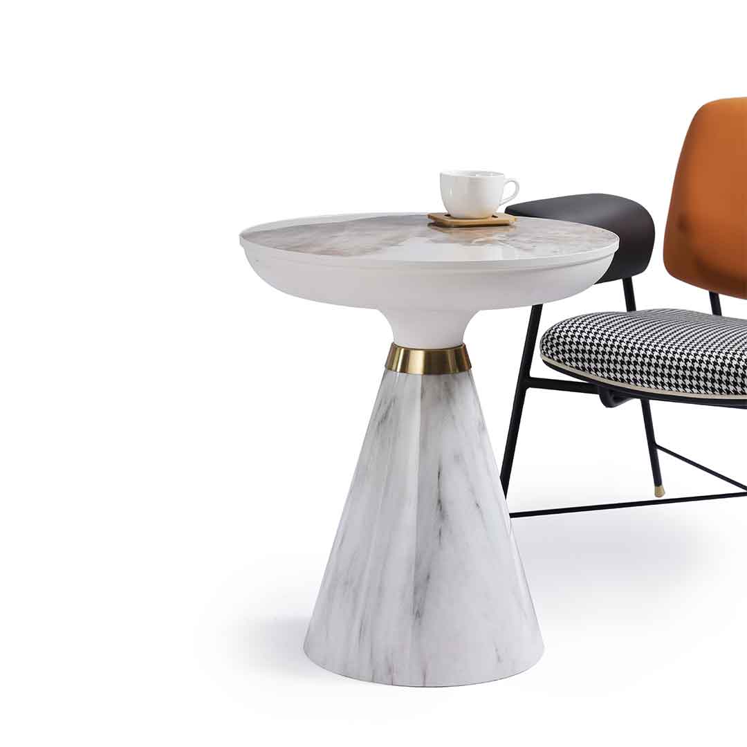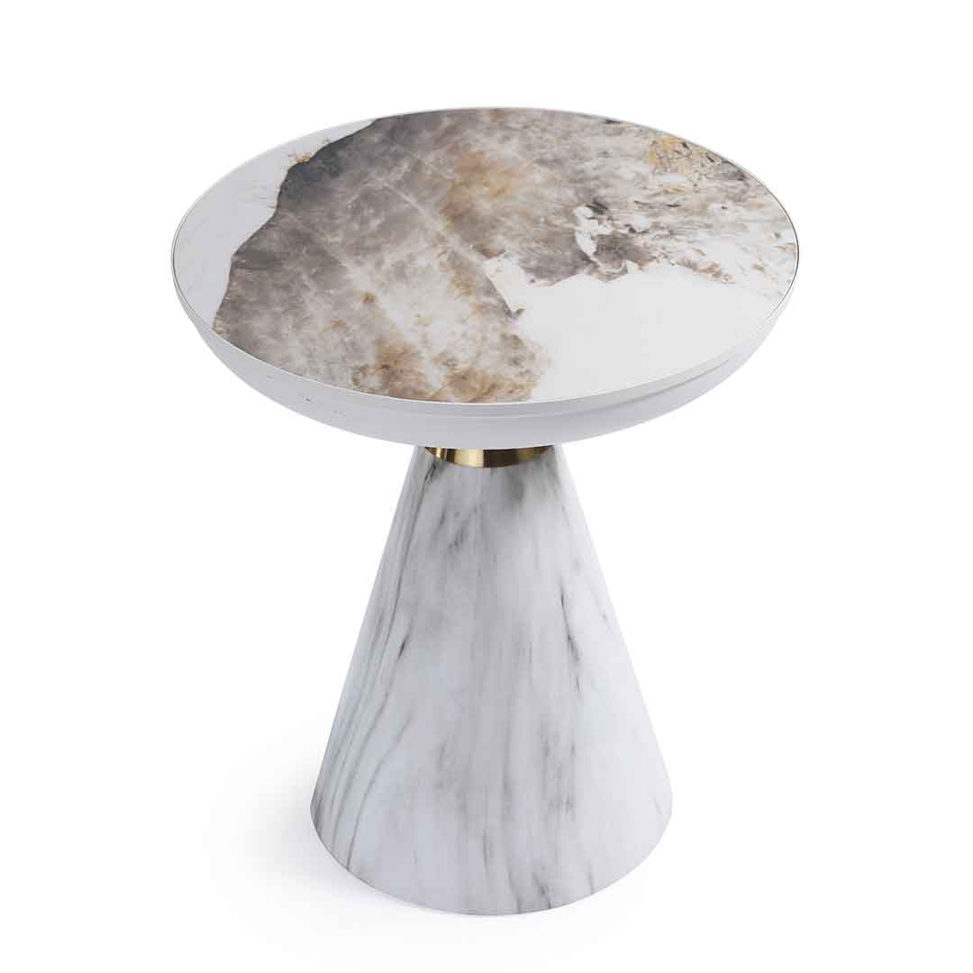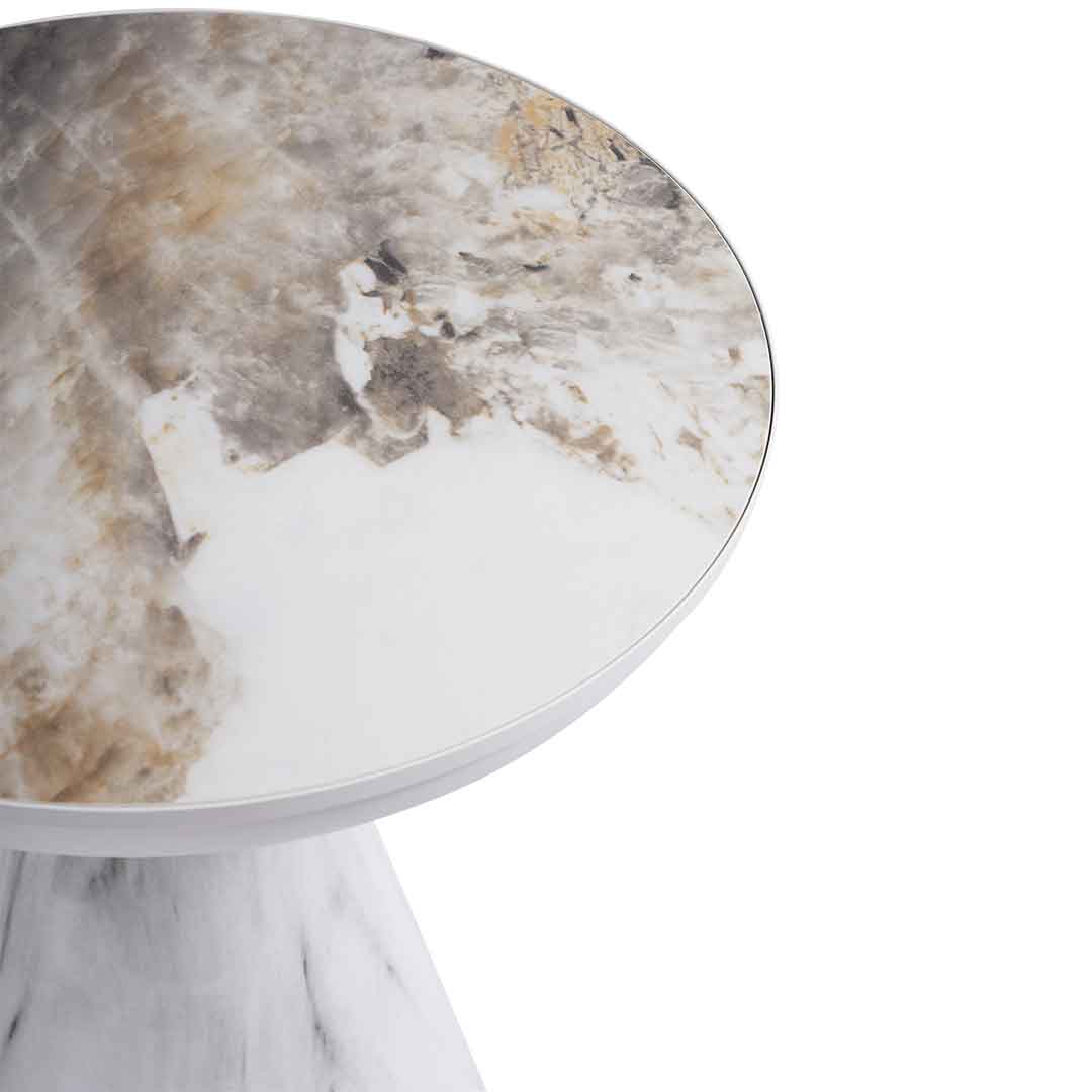 A stunning white round marble table with intricate light brown and grey veining, featuring a white marble bottom for a visually striking effect.
