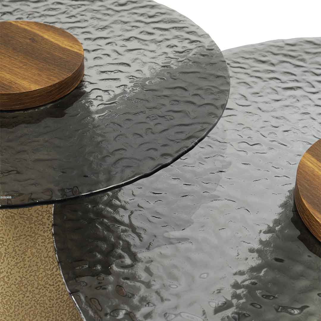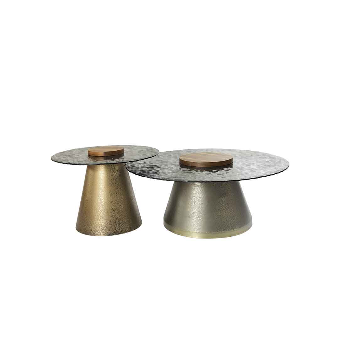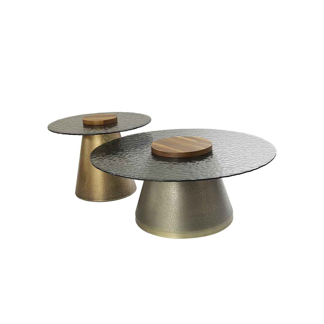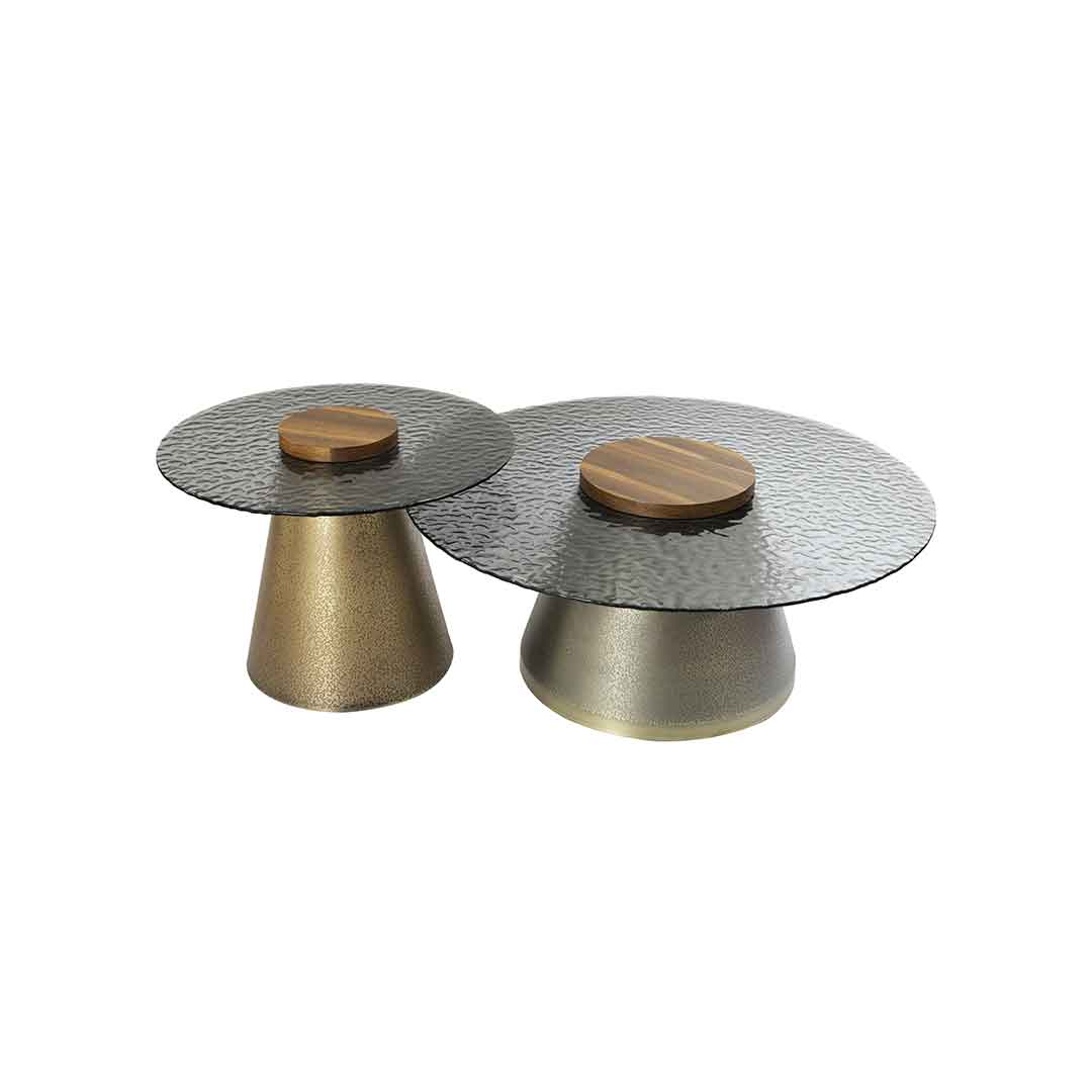 This set includes a large round table with a black glass top and a wooden centerpiece, accompanied by a small round table with a matching design.