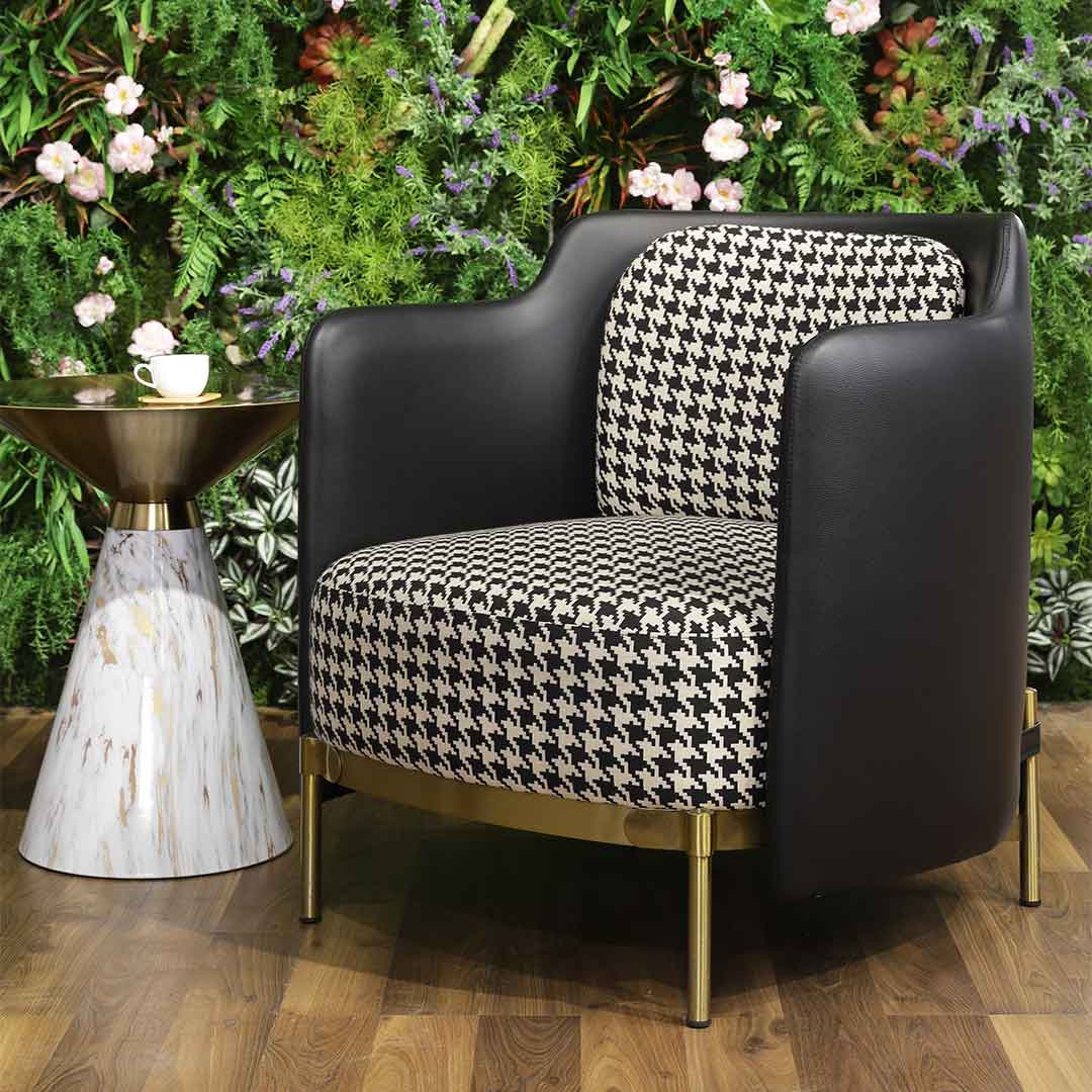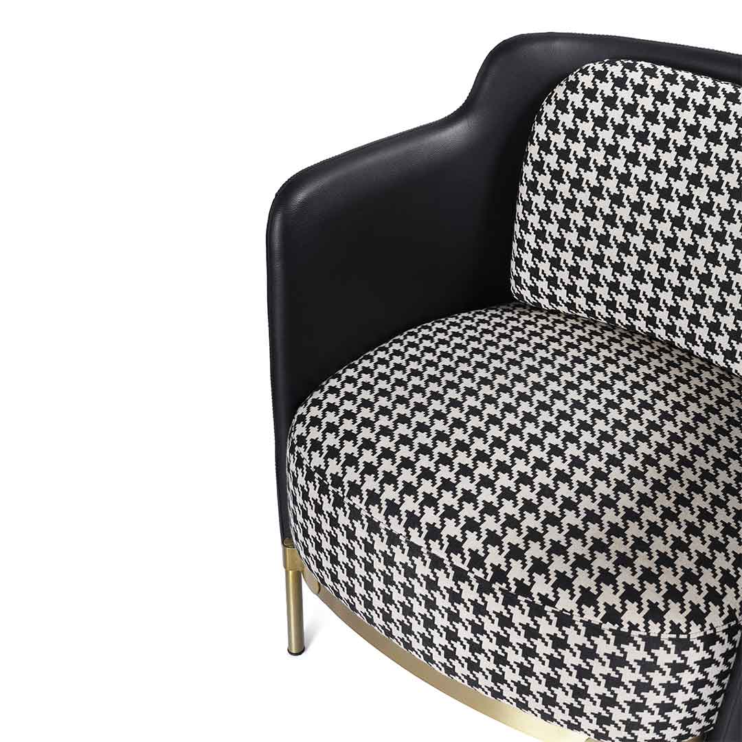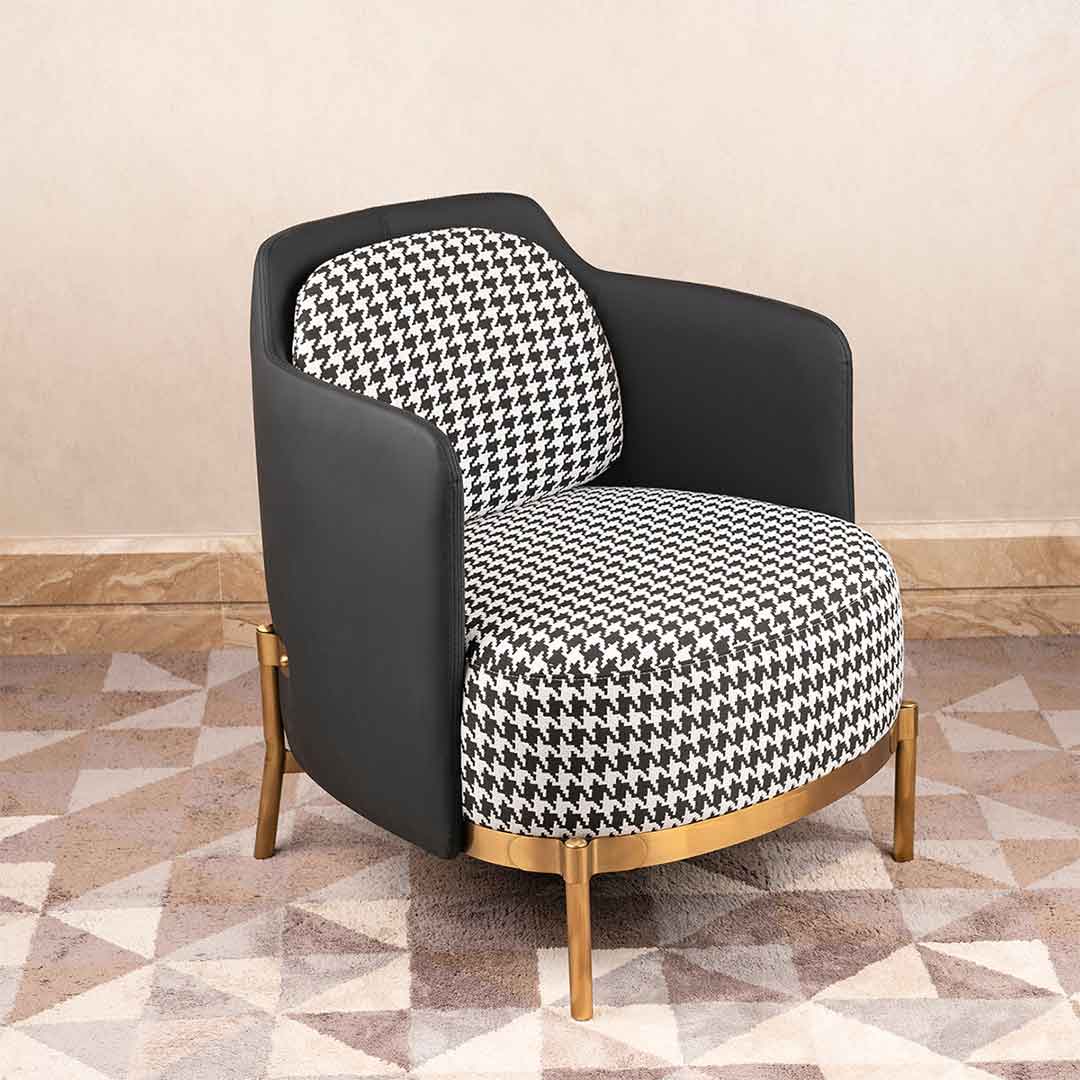 Make a bold statement with our one-seater black and white sofa. The patterned fabric and gold details at the bottom exude a sleek and sophisticated vibe.