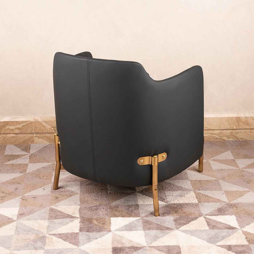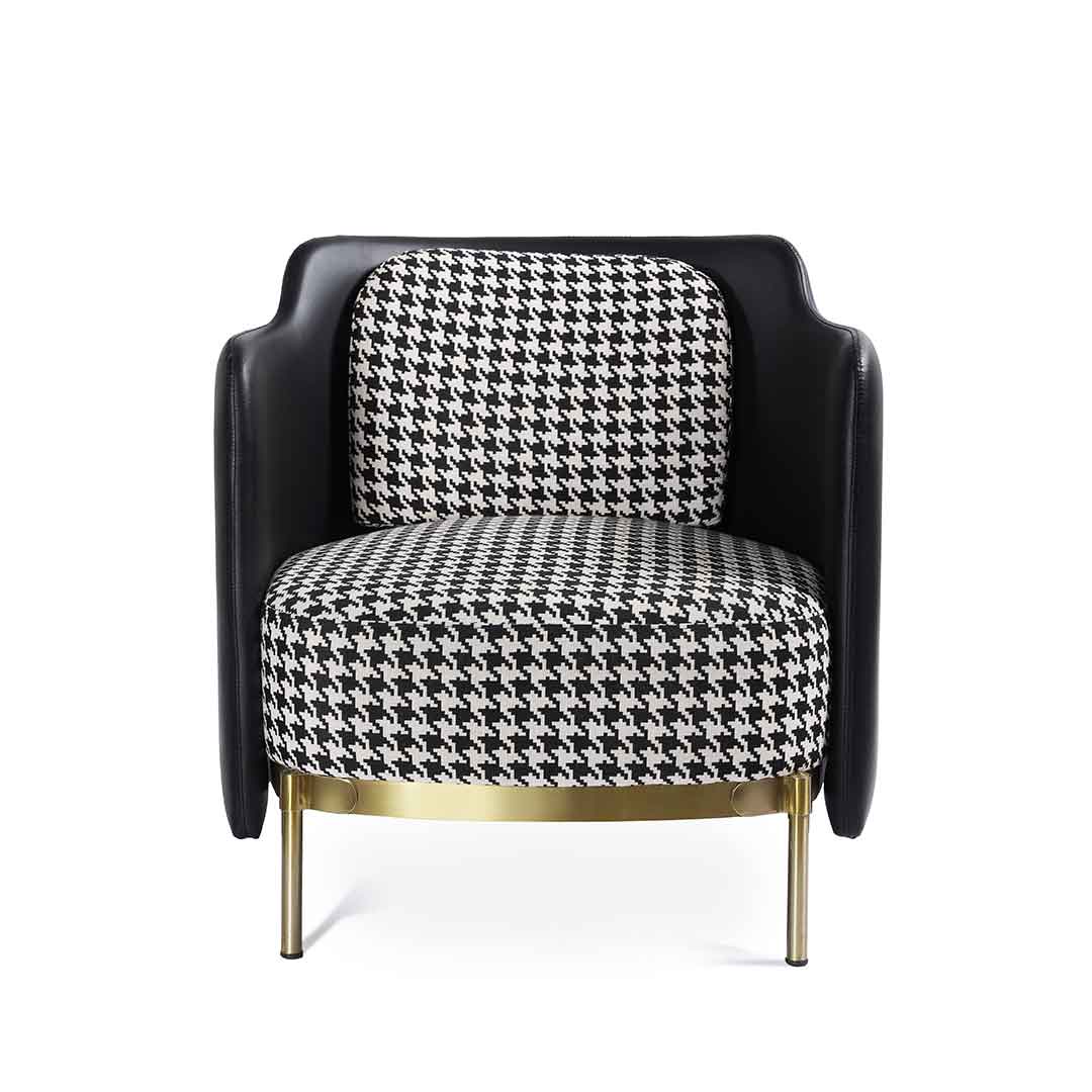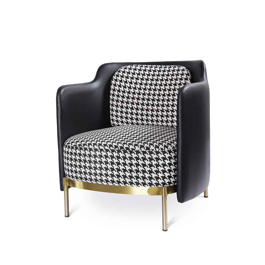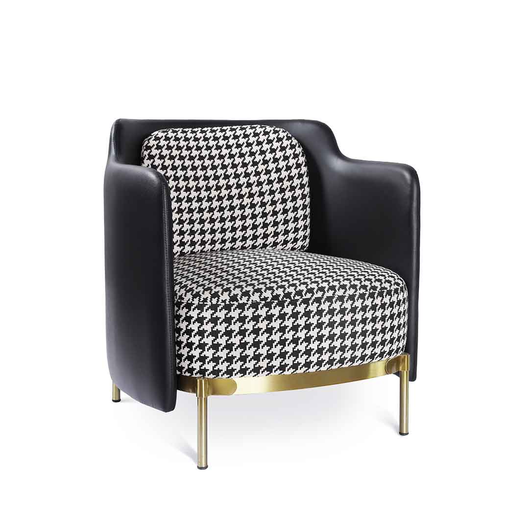 Make a bold statement with our one-seater black and white sofa. The patterned fabric and gold details at the bottom exude a sleek and sophisticated vibe.